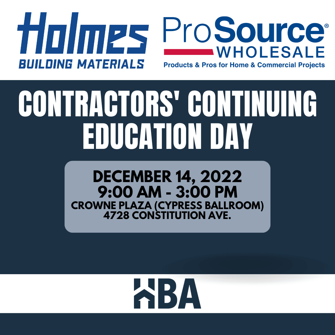 Contractors' Continuing Education Day is hosted by HBA Platinum Industry Partner ProSource Wholesale and Gold Industry Partner Holmes Building Materials. The day will include four (4) topics/sessions (1.5 hours each) to provide builders with all six (6) Continuing Education credits needed for the year.